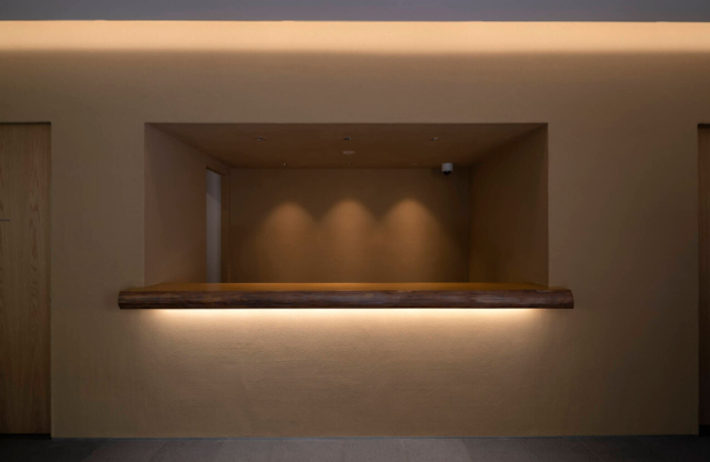 Bước vào cổng phòng khám ở tầng trệt, chào đón các vị khách là một khu vườn toàn những loài cây rụng lá với nền đất được trải thêm đá trang trí. Lý giải cho sự lựa chọn cây rụng lá là do những loài cây này sẽ không che khuất bầu trời trong xanh bên trên, đồng thời có thể khéo léo giấu đi những chi tiết thừa ở khu nhà bên cạnh. Bạn sẽ cảm thấy như mình đang đi thăm quan một tòa nhà lớn nhưng chỉ có 1 tầng. Khu vườn này cũng giúp cung cấp bầu không khí thư giãn cho những vị khách ghé thăm phòng khám, giúp họ thả lỏng và thoải mái hơn.
